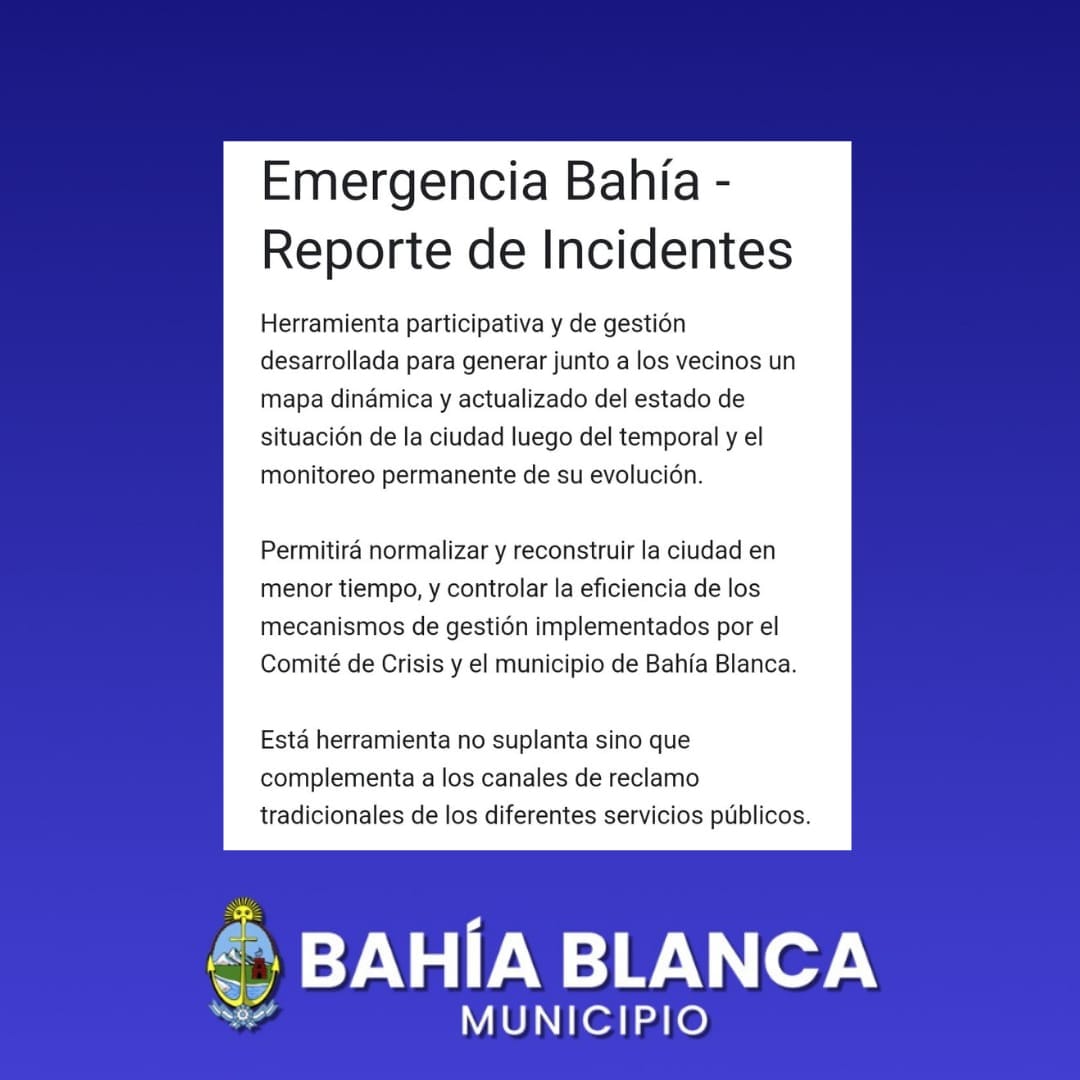 En el link emergenciabahia.com.ar , se podrán reportar incidentes relacionados a árboles caídos, voladura de techo, escombros, seguridad alimentaria, postes o cables caídos, gas, agua, electricidad, entre otros. Además, se podrá detallar la severidad del hecho y la afectación del espacio público y privado.