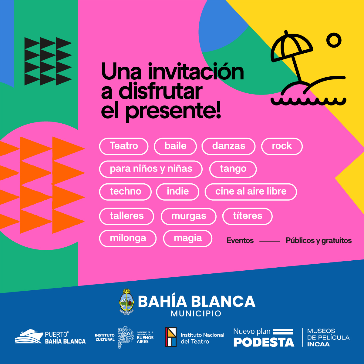 Las propuestas tendrán lugar en diversos puntos de Bahía Blanca. Abarcan teatro, baile, danzas, rock para niños y niñas, tango, techno, indie, cine al aire libre, talleres, murgas, títeres, milonga, magia y más.